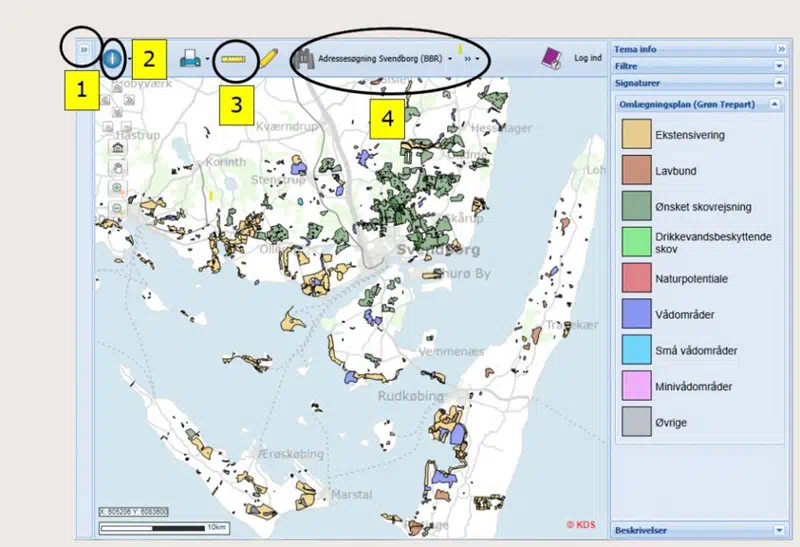 - Ved at trykke på pilene i venstre hjørne åbner du lagpanelet (1). Her kan du tænde og slukke for tilgængelige støttelag. F.eks. beskyttet natur og matrikelkort. OBS! Har du tilføjet et lag, der ikke vises (fremstår gråt i lagpanelet), skal du zoome længere ind på kortet (det gælder f.eks. matrikelkortet og højdekurver).
