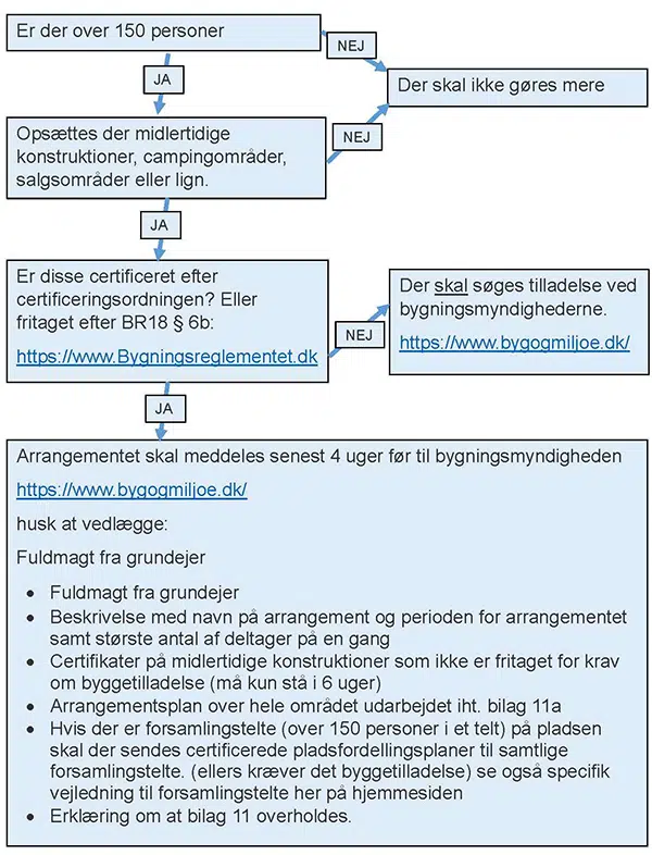 Det er muligt at overnatte i et lokale eller i en bygning, som ikke i forvejen er godkendt til overnatning, f.eks. en skole eller idrætshal. "Midlertidig overnatning" er defineret som max. 7 døgn og max. 50 døgn på et kalenderår. Kommunen skal jf. bygningsreglementet §6g modtage anmeldelse om midlertidig overnatning senest 2 uger før første overnatningsdøgn. Omfatter overnatningen flere end 150 personer, skal kommunen have modtaget meddelelse om overnatningen senest 4 uger før.